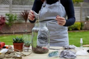 - Add some pebbles to cover the soil, and then anything else you want in order to personalise your terrarium.