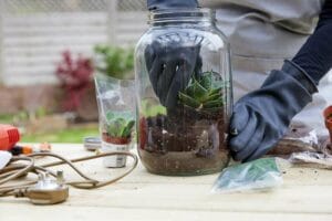 - Use the terrarium kit to fill your mason jar. Start with small stones and pebbles for the base for water drainagepurposes.
