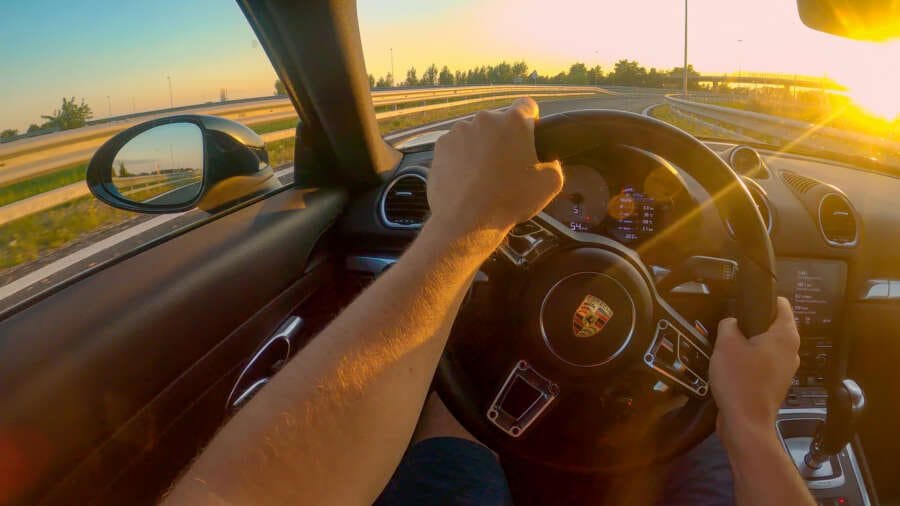 HIGHWAY IN SLOVENIA, AUGUST 2020: POV, LENS FLARE: First person shot of cruising down freeway in a Porsche at golden sunset. Driving a brand new sportscar down an empty highway crossing rural Slovenia