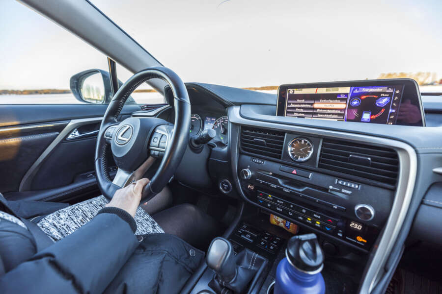 Uppsala. Sweden. 02.15.2021.Close up view of female driving Lexus car. Car interiors concept.