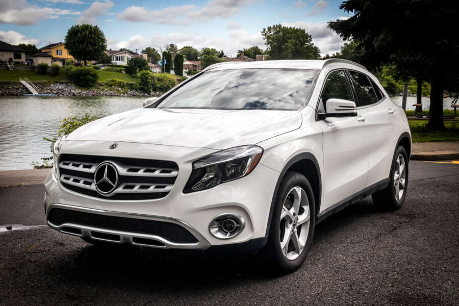 Sorel-Tracy, Canada – July 30, 2021: Mercedes Benz GLA 250 2019 white car outdoor shot at summer