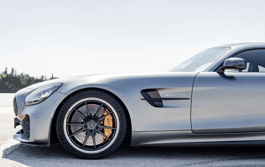 Calafat, Spain, April 18, 2021: detail side view of a mercedes benz AMG GT R, parked in the waiting area before leaving for the circuit. Supercar rally in Tarragona, Spain.