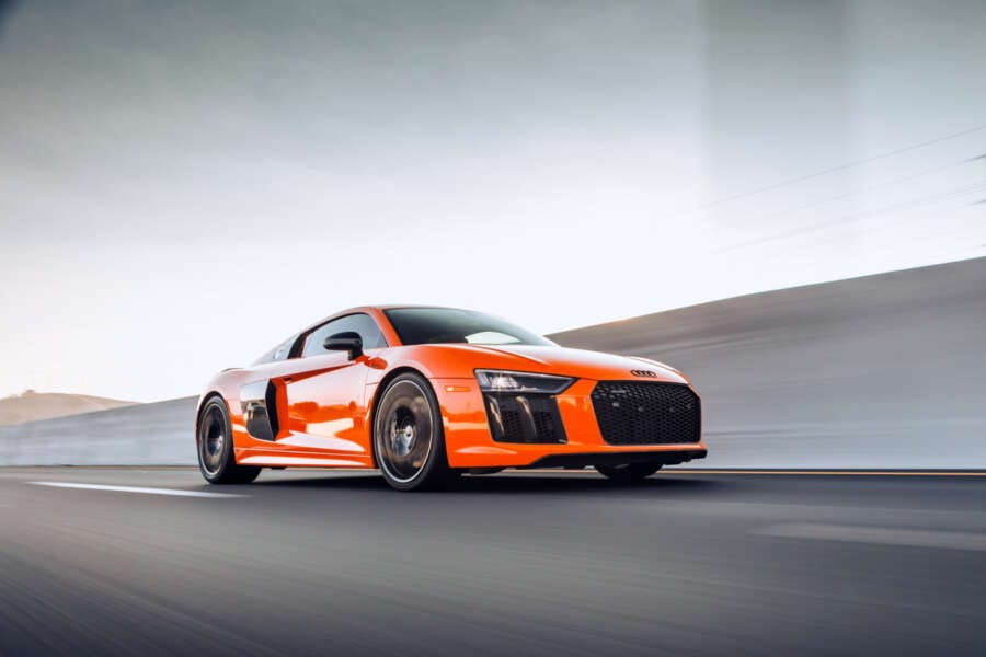 Orange Audi R8 driving on the highway
