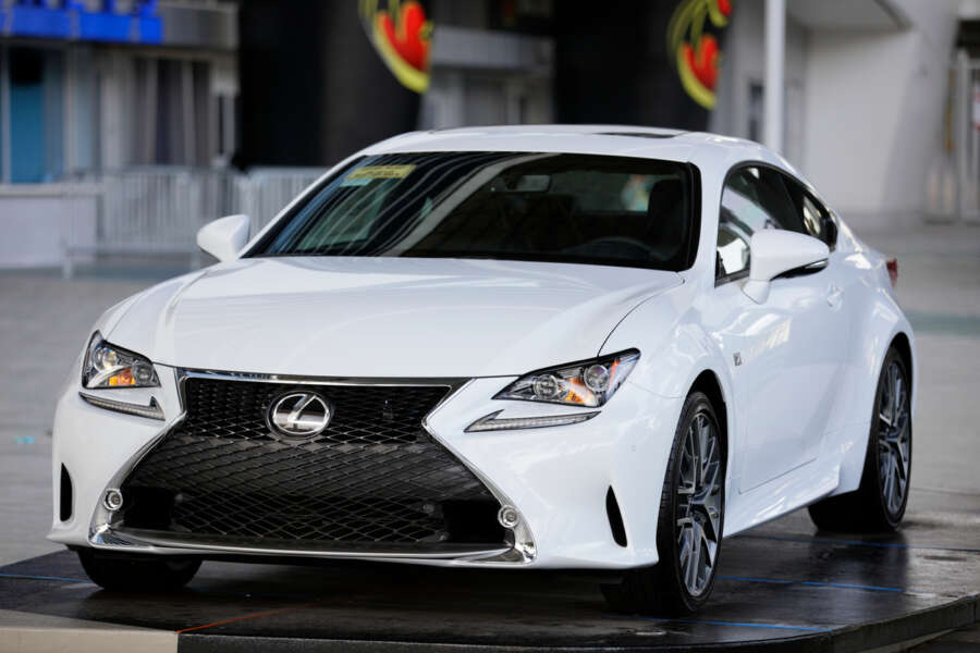 Miami, USA – July 1, 2015: Stock image of the 2015 Lexus RC 350 sports coupe in white.